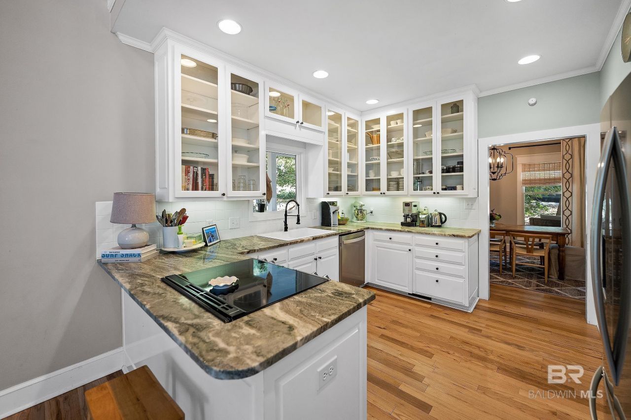 Custom-built 5-bedroom, 3.5-bath modern country farmhouse nestled beneath mature oak trees in the heart of Fairhope. Situated on a cul-de-sac with limited through traffic, this property is approximately one mile from downtown Fairhope and the Mobile Bay waterfront, offering convenient access to local shops, restaurants, parks, the pier, parades and other community events. This spacious home features hardwood flooring, high ceilings, extensive trim and crown molding, recessed lighting, and numerous windows and French doors providing abundant natural light. The functional floor plan includes separate living and family rooms, creating flexible gathering and entertaining spaces. The updated kitchen offers granite countertops, stainless appliances, tile backsplash, glass-front cabinetry, a walk-in pantry, breakfast bar, and adjoining dining areas. The main-level primary suite includes an updated bath with dual vanities, granite countertops, tiled shower, and walk-in closet. Upstairs features a total of 4 additional bedrooms, including a Jack-and-Jill layout, primary en-suite with walk-in closet and a loft/flex space suitable for office, study, or recreation. The outdoor space boasts an incredible three-sided wrap-around porch, ideal for sunrise views, with a screened area off the kitchen and a vast, peaceful backyard shaded by majestic oak trees?perfect size for adding a pool! Additional exterior highlights: Hardie Plank siding, sprinkler system with separate meter, gutters, side-entry double garage, and storage beneath the rear portion of the home. Additional improvements include: 40-year metal roof less than 5 years old, Two-zone HVAC systems recently replaced, Alarm system, Termite contract in place, home warranty offered, and NO HOA. Come enjoy nearby sidewalks, trails, the local golf cart vibe and some of the most beautiful sunsets. Make sought after Fairhope your home in this tranquil country setting today! Buyer to verify all information during due diligence.