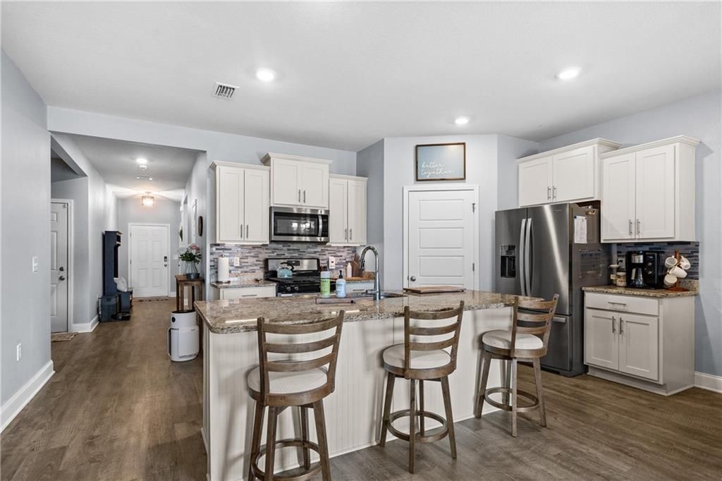 Beautiful 4-bedroom, 2-bath home situated on a desirable over half acre corner lot in Stonebridge with side entry 2 car garage. A spacious foyer welcomes you into an open floor plan featuring 9-foot ceilings and luxury vinyl plank flooring throughout the entire home. The kitchen is thoughtfully designed with painted cabinetry, granite countertops, backsplash, deep stainless undermount sink, stainless appliances, large pantry, and a center island that overlooks the dining area and family room with tray ceilings. The primary suite offers a comfortable retreat with tray ceilings and a well-appointed bath featuring granite countertops, a double vanity, soaking tub, separate 5-foot shower, and a spacious walk-in closet. Three additional bedrooms are located toward the front of the home, along with a full bath, providing flexibility for guests, family, or a home office. Step outside to an inviting fenced backyard designed for entertaining, complete with a dedicated grill station-perfect for relaxing evenings. This Gold Fortified home is complete with Smart Home Technology and gutters. Exceptional amenities include two pools, a fitness center, grilling area, basketball court, playground, and bocce ball court. Buyer to verify all information during due diligence.